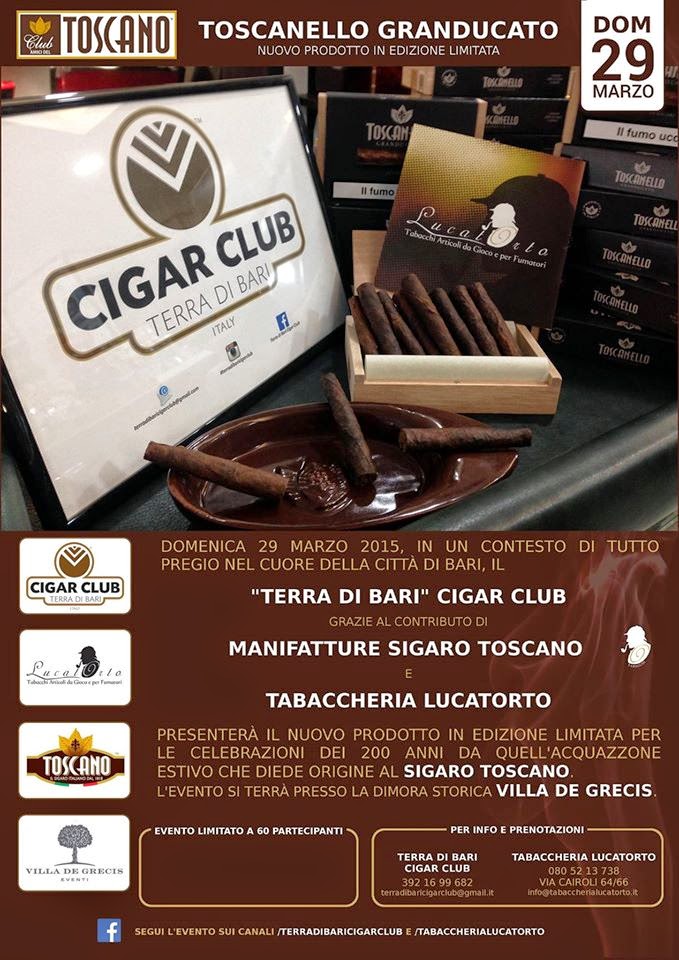 Il Terra di Bari Cigar Club, con il contributo di Manifatture Sigaro Toscano e la Tabaccheria Lucatorto, ha realizzato l’evento per presentare il nuovo Toscanello Granducato in Edizione Limitata per celebrare i 200 anni dalla nascita del sigaro Toscano.